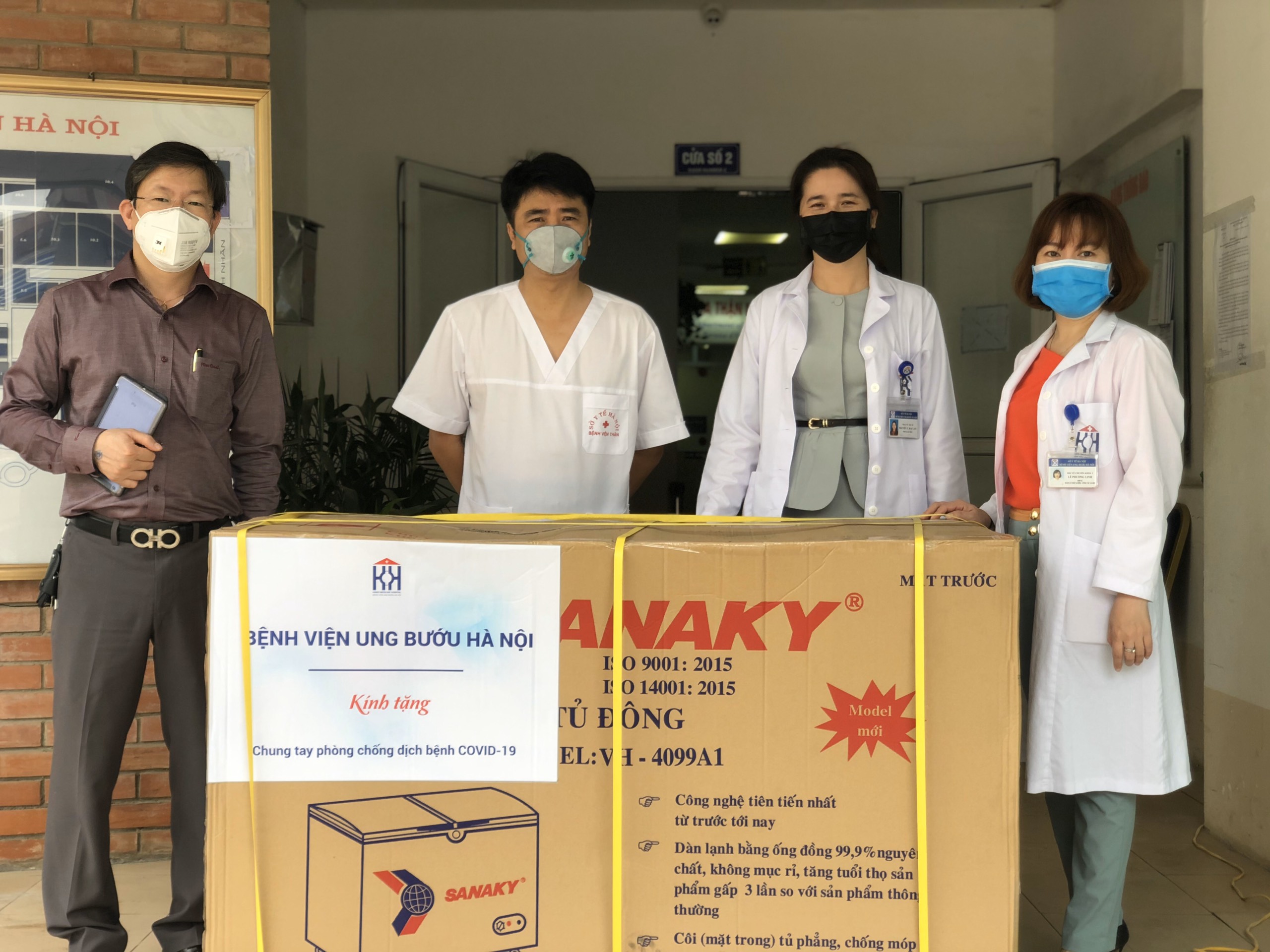 Là bệnh viện cùng trong ngành y tế Hà Nội, với mong muốn hỗ trợ Bệnh viện Thận Hà Nội trong thời gian cách ly, ngày 21/4/2020, đại diện Bệnh viện Ung Bướu Hà Nội đã đến Bệnh viện Thận Hà Nội trao tặng 1 tủ trữ đông SANAKY 400 lít.
