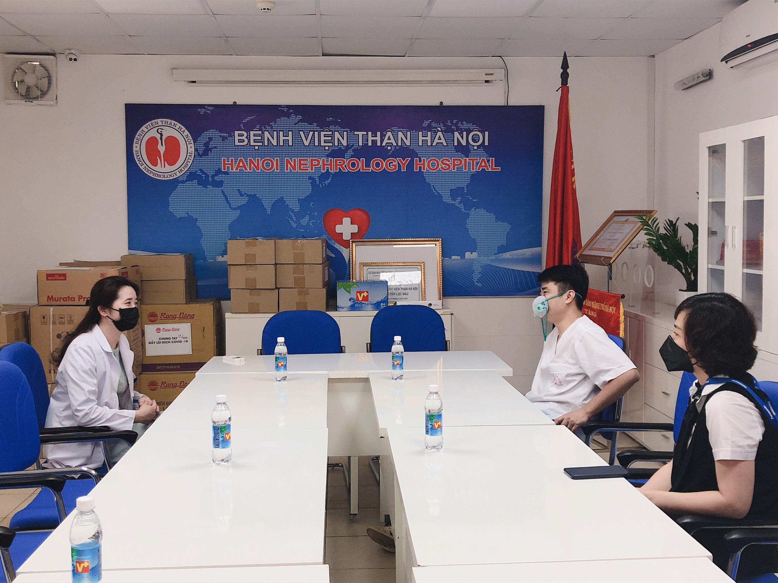 Trong cuộc trò chuyện với BS. Nguyễn Thế Lương - Phó Giám đốc Bệnh viện Thận Hà Nội, TS.BS Nguyễn Thị Mai Lan – Phó Giám đốc Bệnh viện Ung Bướu Hà Nội đã hỏi thăm tình hình và chia sẻ trước những khó khăn mà Bệnh viện Thận Hà Nội đang phải đối mặt, đồng thời hy vọng món quà nhỏ này có thể góp phần tiếp thêm sức mạnh giúp Bệnh viện Thận Hà Nội an toàn vượt qua dịch bệnh.