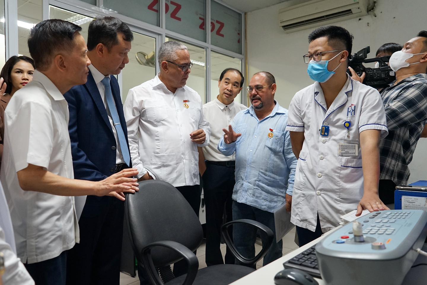 Giới thiệu với đoàn đại biểu cấp cao Thành ủy La Habana, TS.BS. Bùi Vinh Quang, Giám đốc Bệnh viện Ung Bướu Hà Nội cho biết, Bệnh viện Ung Bướu Hà Nội là bệnh viện tuyến cuối chuyên môn kỹ thuật ung bướu với nhiệm vụ khám và điều trị cho nhân dân Thủ đô cũng như cả nước. Thế mạnh của bệnh viện là phát triển hoàn chỉnh với đầy đủ các chuyên khoa sâu chuyên ngành ung bướu. Các phương pháp điều trị tiên tiến như điều trị miễn dịch, điều trị đích, phẫu thuật nội soi, phẫu thuật xâm lấn tối thiểu, phẫu thuật tạo hình, y học hạt nhân, điện quang can thiệp… đang được áp dụng thường quy tại bệnh viện. Chú trọng hoạt động hợp tác quốc tế, hiện bệnh viện đã có thỏa thuận hợp tác với các bệnh viện, trường đại học, tổ chức phi lợi nhuận về y tế từ Hàn quốc, Mỹ, Pháp, Đài Loan và có đại diện tham gia 9 tổ chức quốc tế trong lĩnh vực ung bướu.