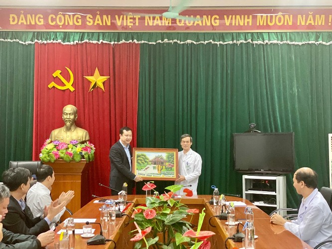 Ảnh 1: TS. BS Bùi Vinh Quang – Giám đốc Bệnh viện Ung Bướu Hà Nội tặng quà lưu niệm cho Bệnh viện Đa khoa tỉnh Sơn La.