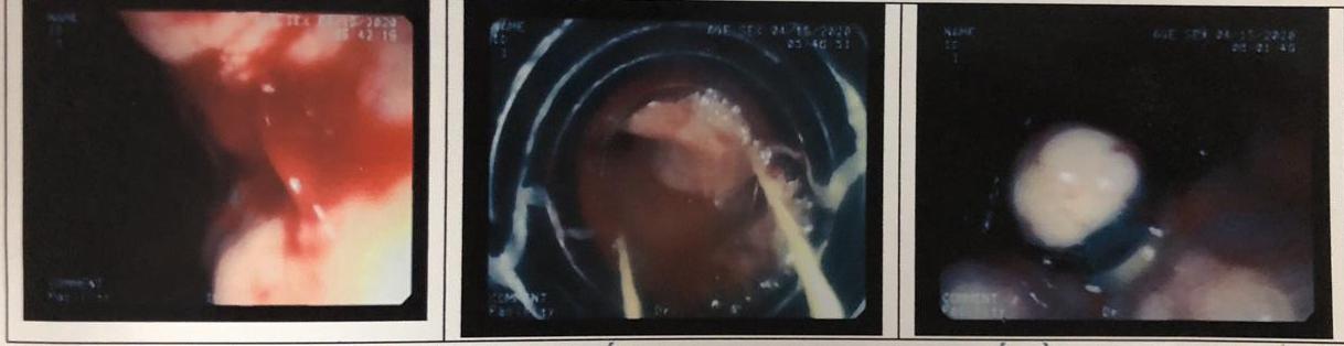 Khi huyết động của bệnh nhân đã ổn định, ekip tiến hành nội soi thăm dò và đánh giá khả năng can thiệp. Đưa ống soi vào thực quản, dạ dày phát hiện bên trong có rất nhiều máu đỏ lẫn máu cục lên đến gần 1000 ml. Thực quản có các tĩnh mạch giãn căng, ngoằn ngoèo nổi cao lên khỏi bề mặt niêm mạc, gần tâm vị có búi tĩnh mạch bị giãn vỡ, máu đang phun thành tia.