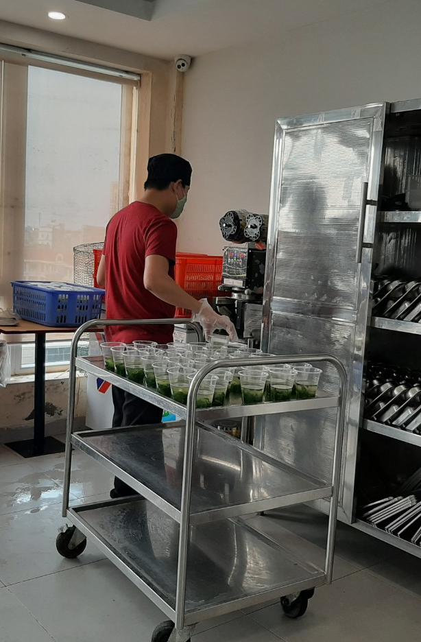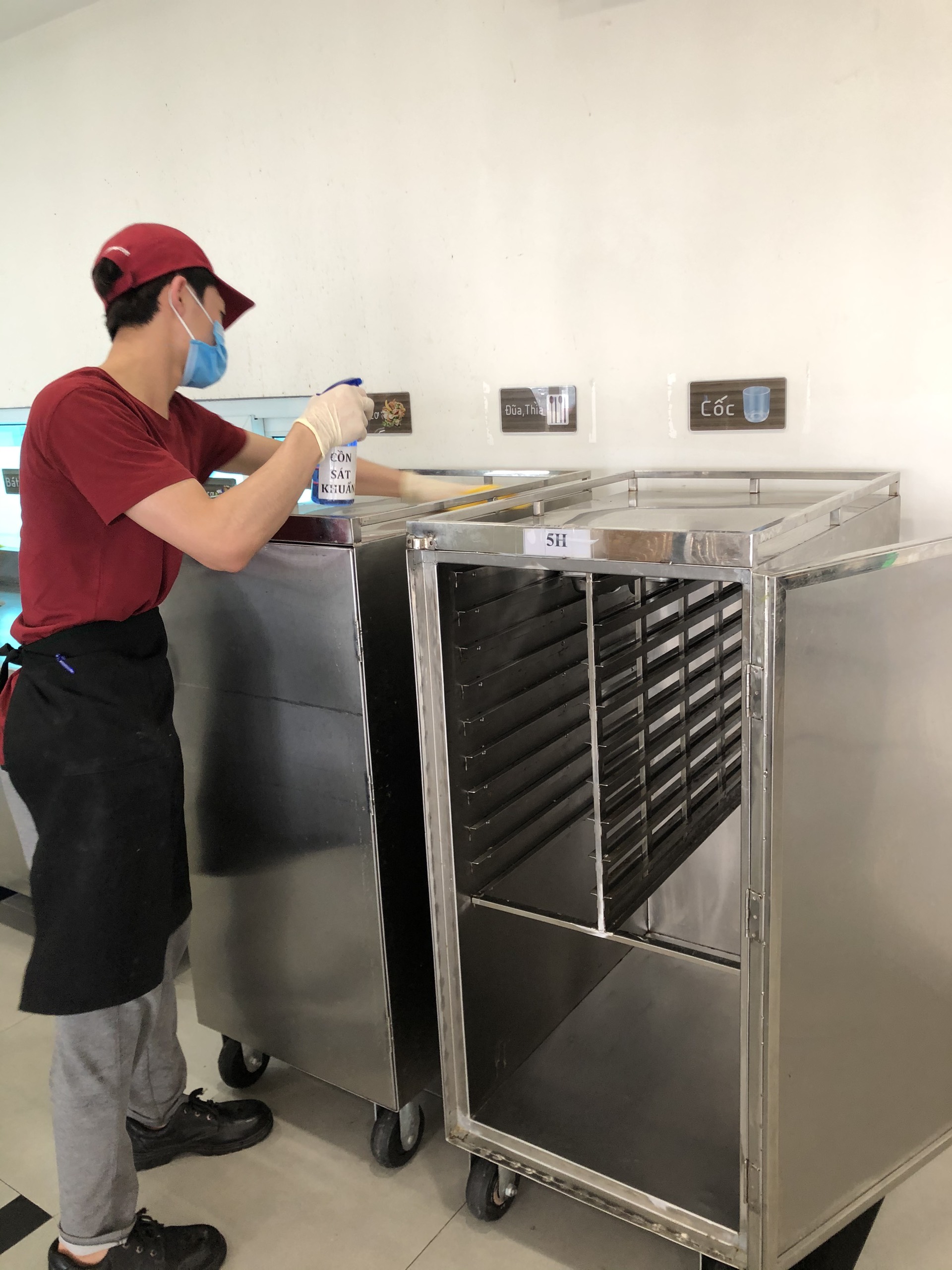 + Xe đựng suất ăn được vệ sinh bằng các dung dịch khử khuẩn ngay trước khi xếp các suất ăn vào xe