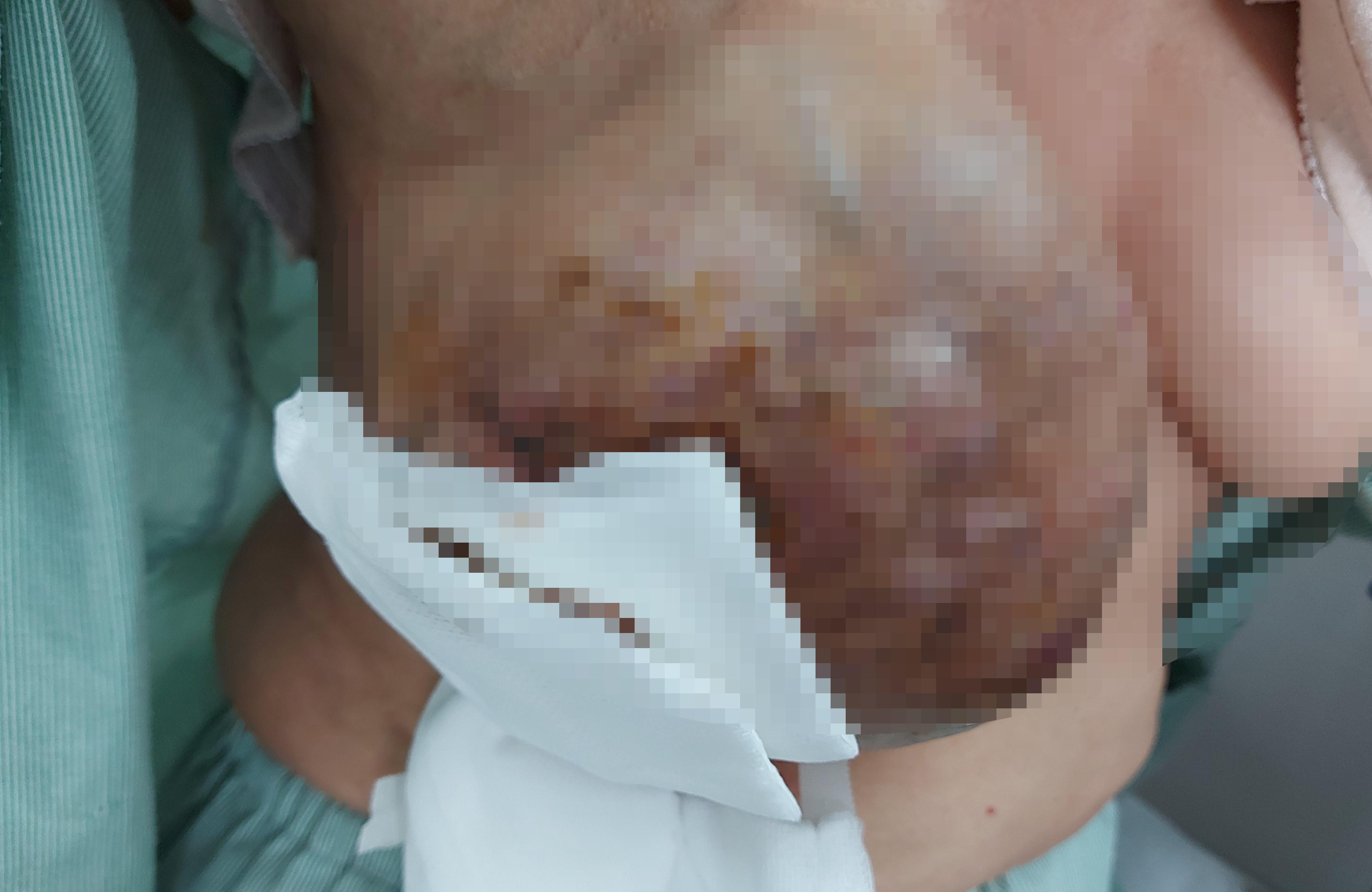 Bà D.T.T trú tại Hoàng Mai – Hà Nội đến Bệnh viện Ung Bướu Hà Nội trong tình trạng ngực bên phải sưng to như quả bưởi, sùi loét, phun máu thành tia, chảy nhiều dịch có mùi hôi. Bà T. cho biết đã xuất hiện khối u khoảng 20 năm, ban đầu chỉ như quả trứng chim cút. Khi u to dần, bà tự điều trị theo sự mách bảo của mọi người như uống mật động vật, cao hổ cốt, xạ đen… nhưng khối u ngày càng phát triển. Khoảng 5 năm nay, ngực bà trở nên bầm tím, lở loét, thỉnh thoảng rỉ máu, bốc mùi khó chịu.