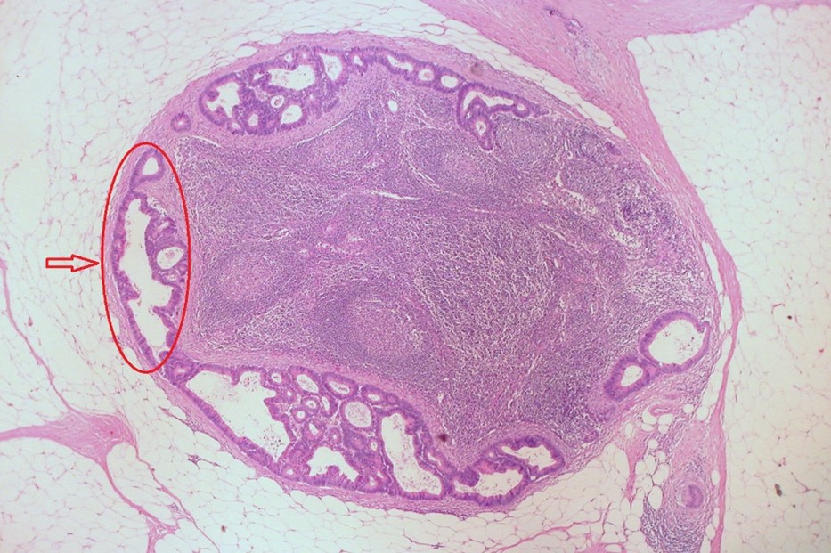 Hình 2. Hình ảnh hạch bạch huyết có ung thư di căn làm mất cấu trúc xoang