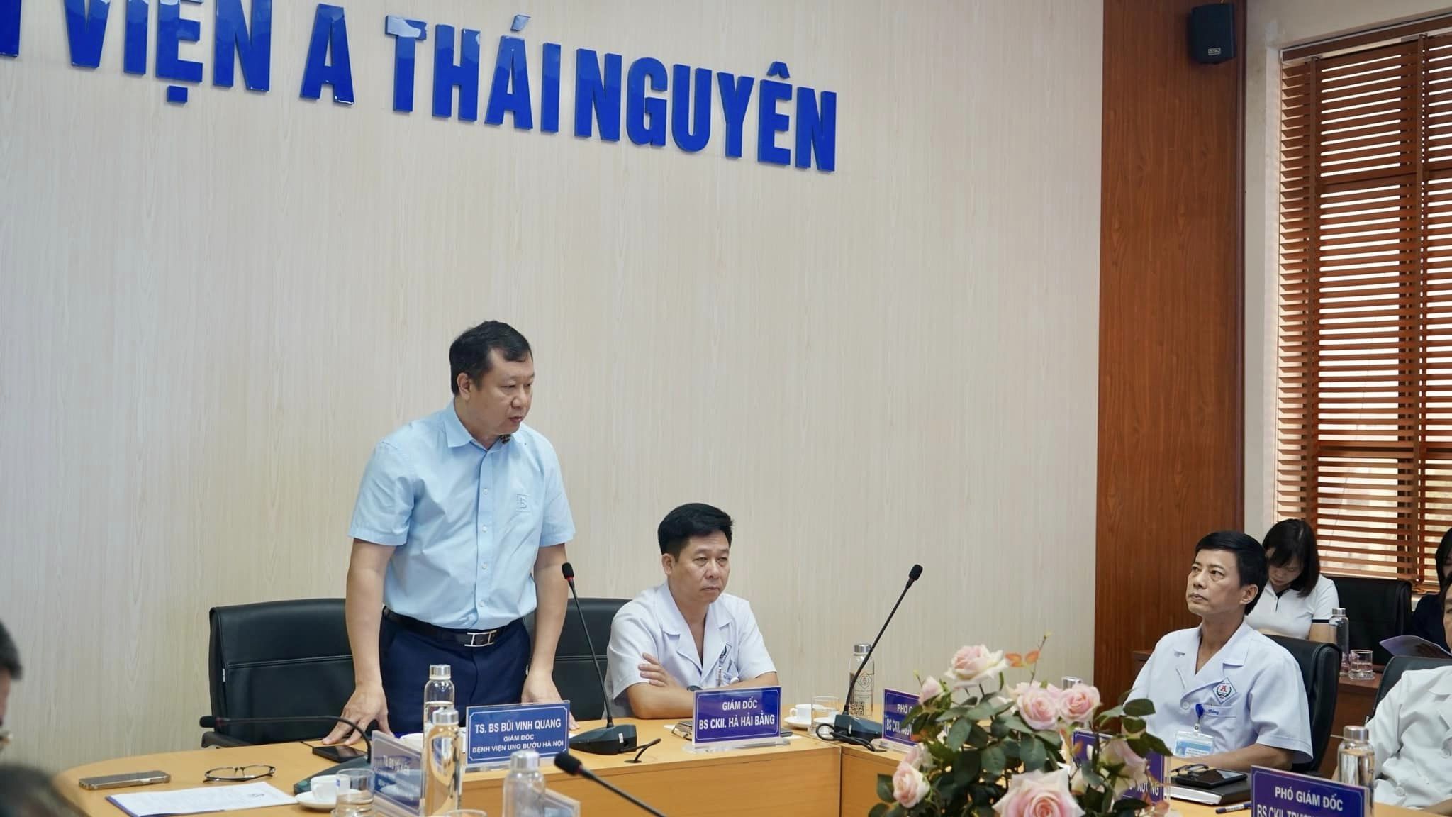 Trong bài phát biểu mở đầu, BS.CKII. Hà Hải Bằng - Giám đốc Bệnh viện A Thái Nguyên cho biết, bệnh viện A Thái Nguyên là 1 trong 3 bệnh viện hạng I của tỉnh Thái Nguyên, có lịch sử gần 60 năm với cơ sở vật chất, trang thiết bị được đầu tư khang trang, hiện đại. Bệnh viện là cơ sở thực hành của Đại học Y Dược Thái Nguyên, bệnh viện vệ tinh của Bệnh viện Nhi Trung ương và Bệnh viện Phụ sản Trung ương. Trước thực trạng dân số của tỉnh lớn với nhiều khu công nghiệp, kèm theo đó là nhu cầu khám chữa bệnh và chăm sóc sức khỏe của người dân cao, bệnh viện A Thái Nguyên đề ra mục tiêu trở thành bệnh viện đa khoa hoàn chỉnh, trong đó chú trọng phát triển chuyên khoa ung bướu, nhằm giúp người dân được tiếp cận, thụ hưởng ngay từ bước thăm khám ban đầu cho tới điều trị chuyên sâu các bệnh lý ung bướu. Vì vậy, chúng tôi hy vọng trong thời gian tới, bệnh viện A Thái Nguyên sẽ nhận được sự hỗ trợ chuyên môn từ Bệnh viện Ung Bướu Hà Nội – bệnh viện chuyên khoa tuyến cuối để có thể từng bước thực hiện mục tiêu của mình.