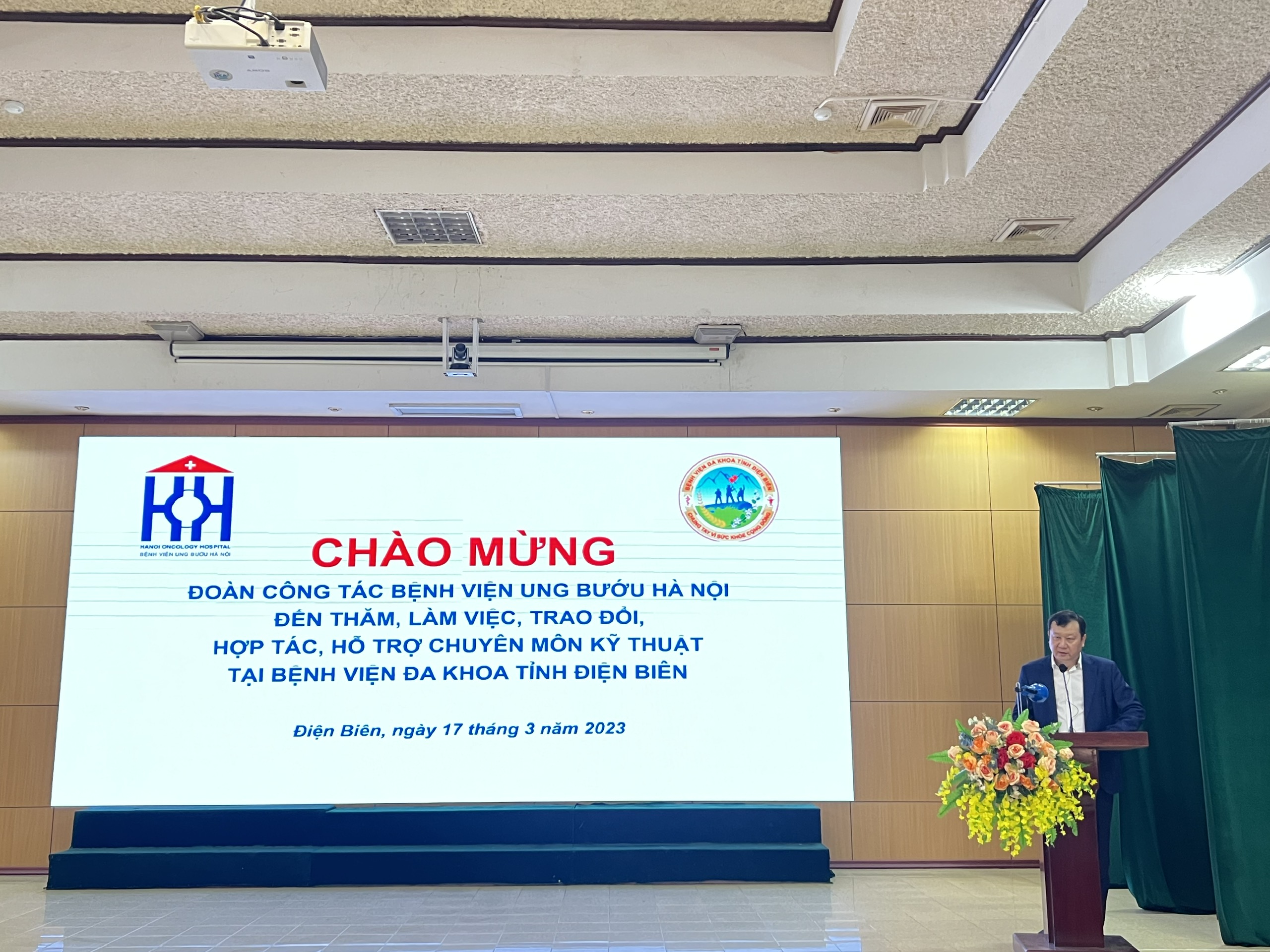 Phát biểu tại buổi làm việc, ThS.BSCKII. Vũ Văn Hải – Phó Giám đốc phụ trách Bệnh viện Đa khoa tỉnh Điện Biên đã giới thiệu về những thành tựu của bệnh viện trong 30 năm phát triển để trở thành một bệnh viện đa khoa tuyến đầu của toàn tỉnh, là địa chỉ tin cậy cho không chỉ người dân Điện Biên mà còn cả các địa phương lân cận. Lãnh đạo Bệnh viện Đa khoa tỉnh Điện Biên cho biết, hiện nay, khoa ung bướu của bệnh viện còn khá khiêm tốn với quy mô 30 giường và chỉ có 4 bác sỹ chuyên khoa nên tỷ lệ bệnh nhân phải chuyển tuyến cao, đa phần là bệnh nhân mắc ung thư vú và ung thư tuyến giáp. Trong định hướng phát triển, Bệnh viện Đa khoa tỉnh Điện Biên đặc biệt chú trọng tới chuyên ngành ung bướu nhằm nâng cao trình độ chuyên môn, cập nhật các kỹ thuật cao trong chẩn đoán và điều trị để đáp ứng nhu cầu khám chữa bệnh chuyên ngành ung bướu cho người dân.