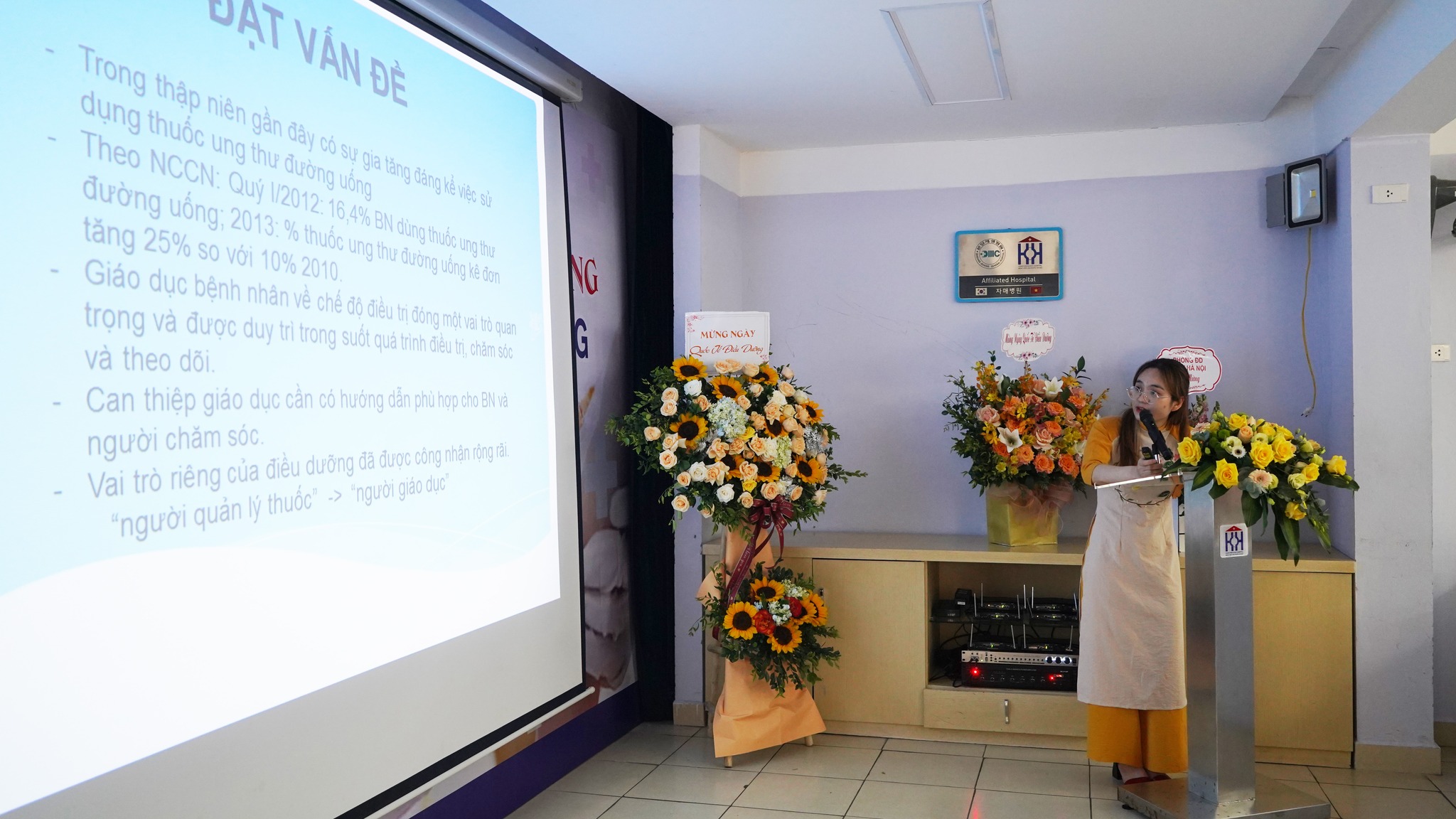Trong phần sinh hoạt khoa học, các điều dưỡng đã được cập nhật những kiến thức bổ ích qua 02 bài báo cáo từ Hội nghị thường niên và Tạp chí của Hiệp hội Điều dưỡng ung thư Quốc tế: Chất lượng cuộc sống của bệnh nhân ung thư đại trực tràng có hậu môn nhân tạo tại Trung Quốc” do Điều dưỡng Nguyễn Thị Hồng Vân – Điều dưỡng trưởng khoa Nội Tiêu hóa Theo yêu cầu trình bày và “Nhận thức của người bệnh và điều dưỡng về hiệu quả của quá trình hướng dẫn sử dụng thuốc ung thu đường uống” do Điều dưỡng Nguyễn Thị Thanh Thủy – khoa Nội Vú, Phụ khoa, Đầu cổ Theo yêu cầu trình bày.