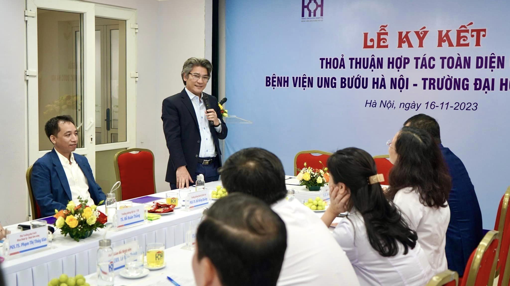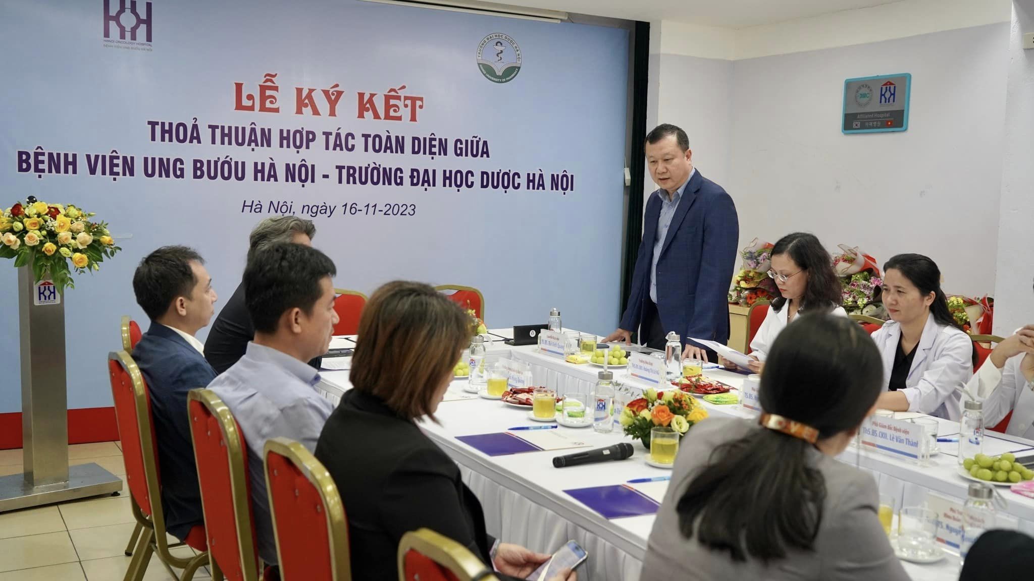 Phát biểu tại buổi lễ, TS.BS. Bùi Vinh Quang – Bí thư Đảng ủy, Giám đốc Bệnh viện Ung Bướu Hà Nội cho biết: “Hợp tác giữa Bệnh viện Ung Bướu Hà Nội và Trường Đại học Dược Hà Nội là một bước tiến quan trọng trong việc nâng cao chất lượng đào tạo, nghiên cứu khoa học và chăm sóc sức khỏe cộng đồng. Ký kết Thỏa thuận Hợp tác sẽ là tiền đề cho các hoạt động hợp tác ở quy mô rộng hơn và chuyên sâu hơn với các kế hoạch dài hạn và bền vững, hướng tới phát triển ngành Dược Việt Nam nói chung và ngành Dược ung bướu nói riêng”.