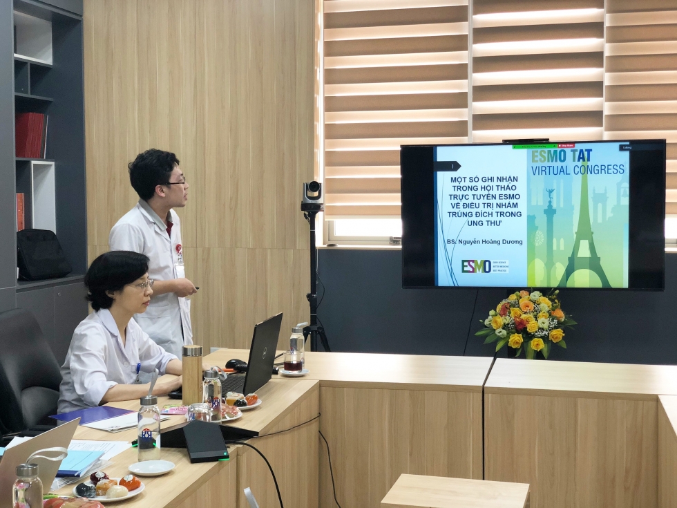 Mở đầu buổi sinh hoạt khoa học, bác sĩ Nguyễn Hoàng Dương, Khoa Nội Tiêu hóa theo yêu cầu báo cáo một số ghi nhận trong hội thảo trực tuyến ESMO về điều trị nhắm trúng đích trong ung thư, trong đó có một số nội dung nổi bật như: Tiến bộ trong sự phân phối thuốc và phức hợp thuốc – kháng thể (ADCs); Giải quyết các mục tiêu “không thể dùng thuốc”; Tiếp cận phương pháp điều trị miễn dịch mới và Nhắm mục tiêu cytokine và oncolytics thế hệ tiếp theo.