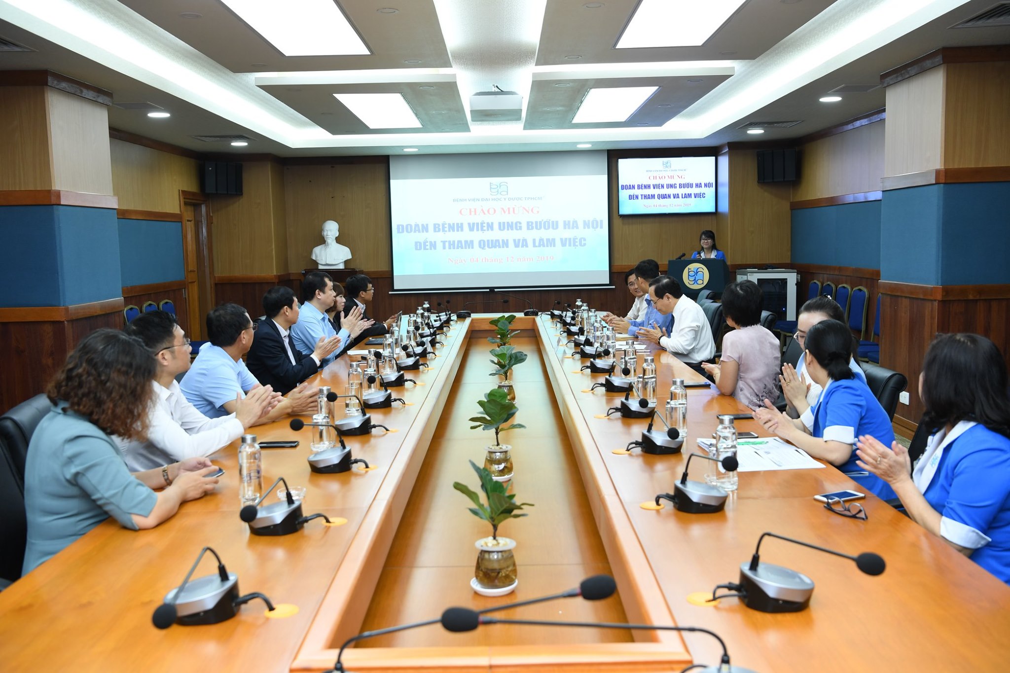 Trước khi đi tham quan bệnh viện, đại diện 2 đơn vị đã cùng trao đổi về ứng dụng công nghệ thông tin trong công tác khám, chữa bệnh và mô hình hoạt động công tác xã hội. Đây là 2 trong số nhiều thế mạnh của Bệnh viện Đại học Y Dược TP HCM.