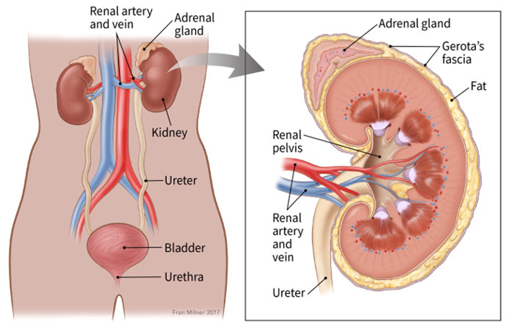 Mỗi người có 2 quả thận. Chúng có hình hạt đậu và có kích thước bằng nắm tay. Chúng làm sạch chất thải ra khỏi máu và biến nó thành nước tiểu. Thận cũng giúp kiểm soát huyết áp và giúp đảm bảo cơ thể có đủ tế bào hồng cầu trong máu.