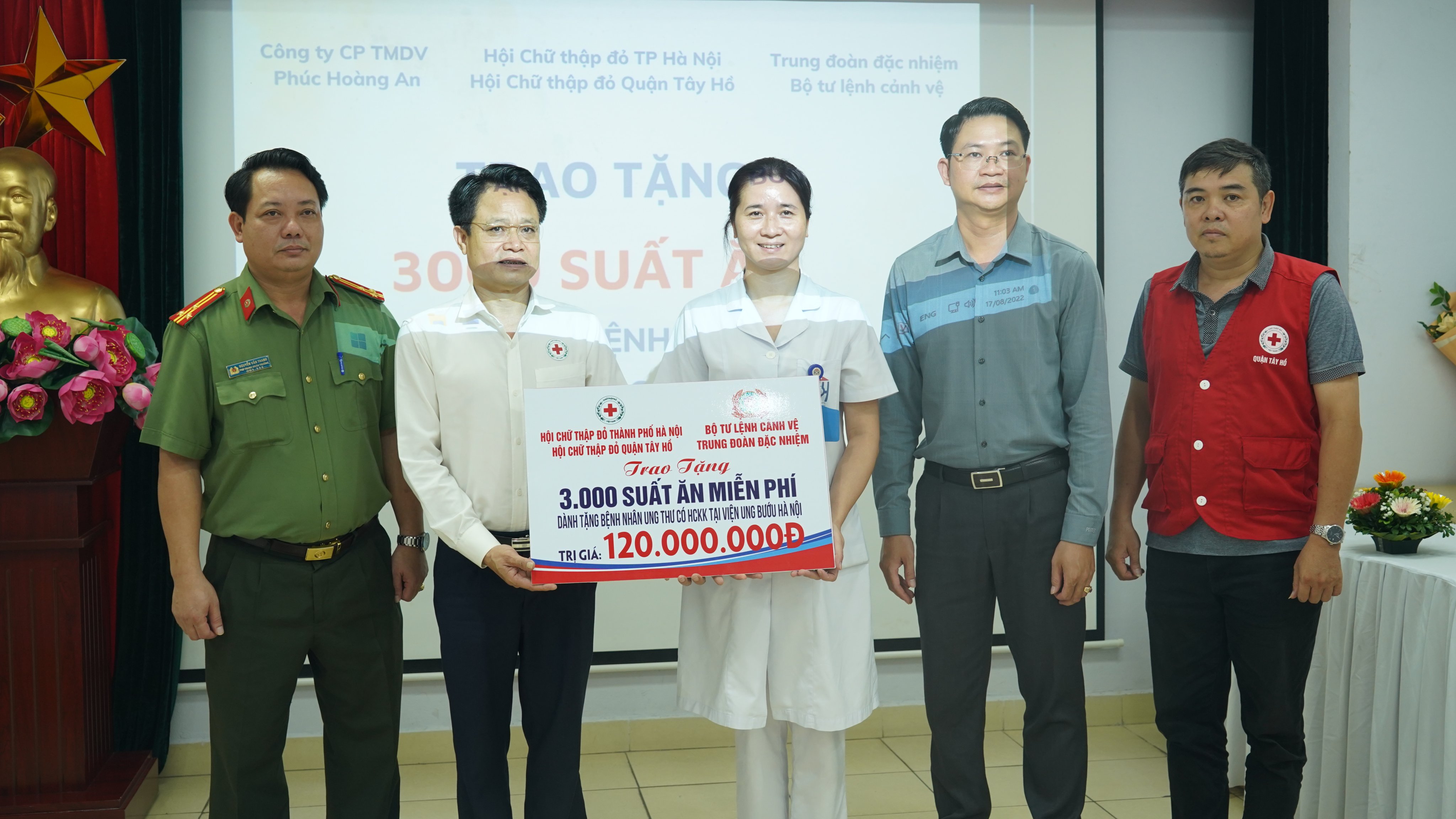 Ngày 17/8/2022, ông Đào Ngọc Triệu - Chủ tịch Hội Chữ thập đỏ Thành phố Hà Nội, ông Vương Kim Cương – Chủ tịch Hội Chữ thập đỏ quận Tây Hồ, ông Nguyễn Văn Thanh – Phó Trung đoàn trưởng Trung đoàn Đặc nhiệm - Bộ Tư lệnh Cảnh vệ và bà Vũ Thị Thảo – Giám đốc Công ty Cổ phần Thương mại Dịch vụ Phúc Hoàng An cùng các đồng nghiệp đã tới bệnh viện Ung Bướu Hà Nội trao tặng 50 suất ăn đầu tiên trong chương trình kéo dài từ nay đến hết ngày 31/12/2022.